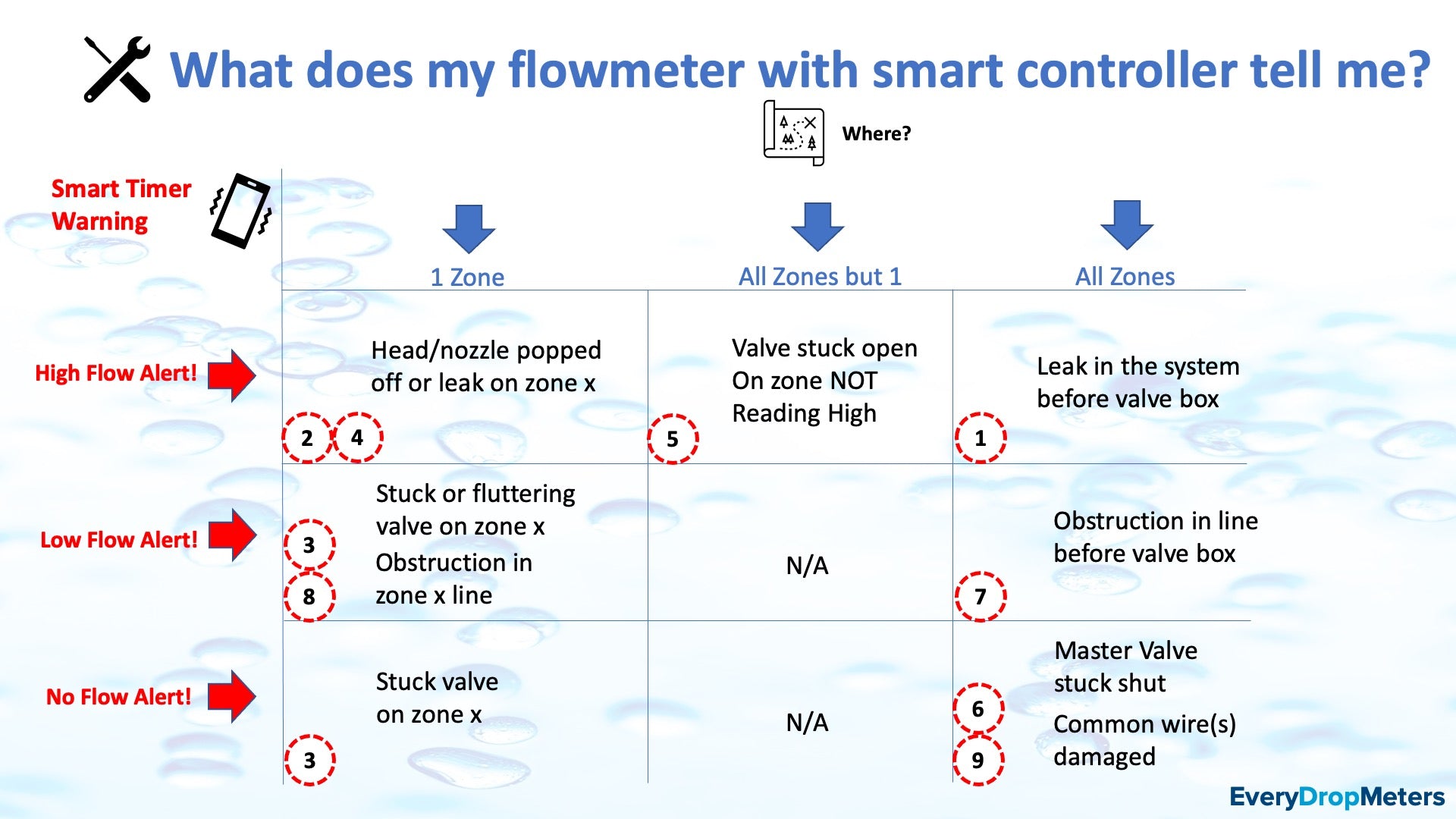 - The controller uses the accurate, repeatable flow from the Everydrop flow meter against expected values and sends warnings to your device that correspond to the chart.