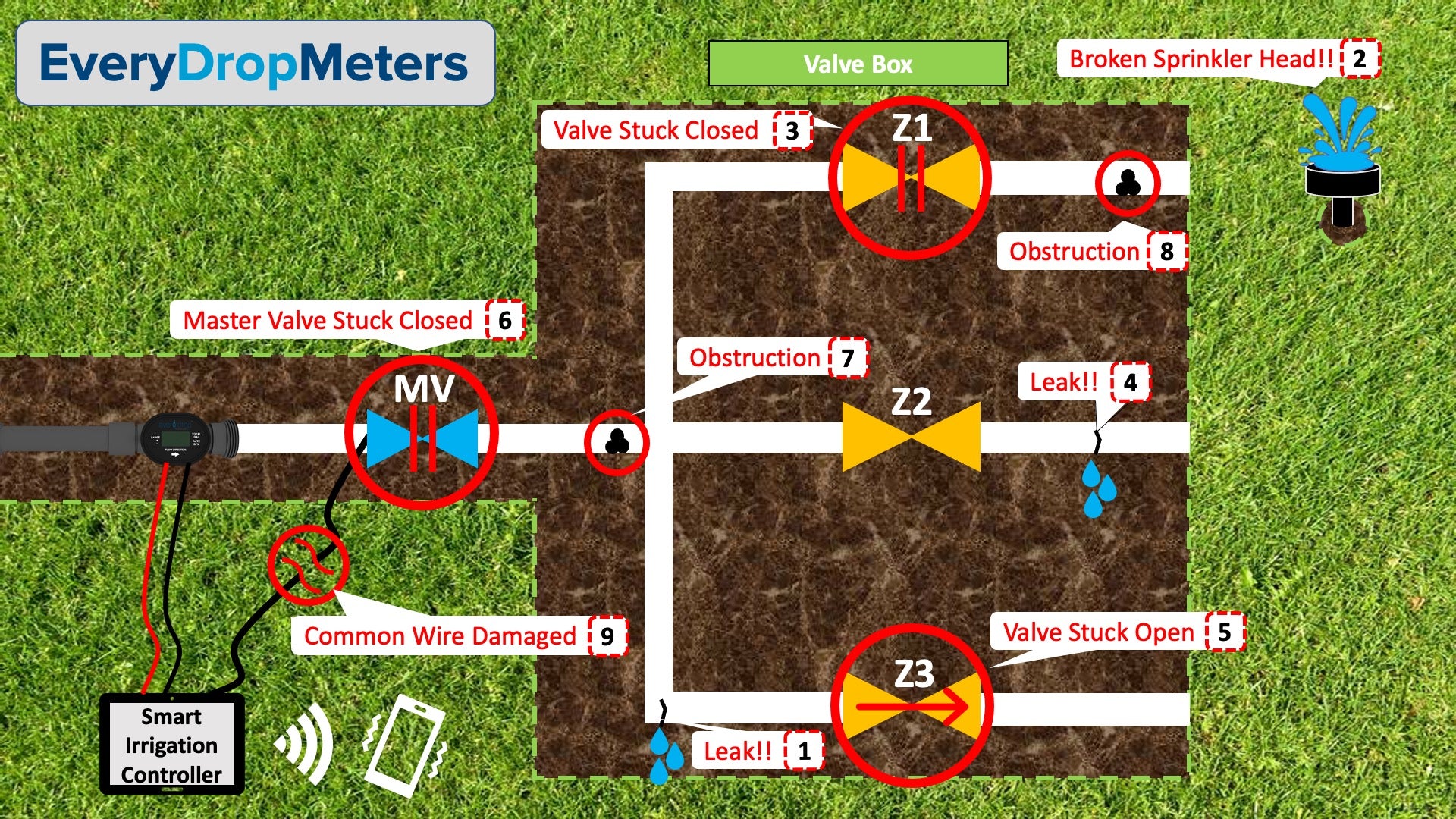 - A failure occurs in your irrigation system in one of the ways shown in the diagram.